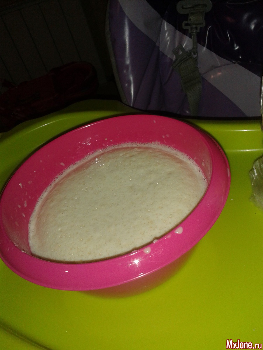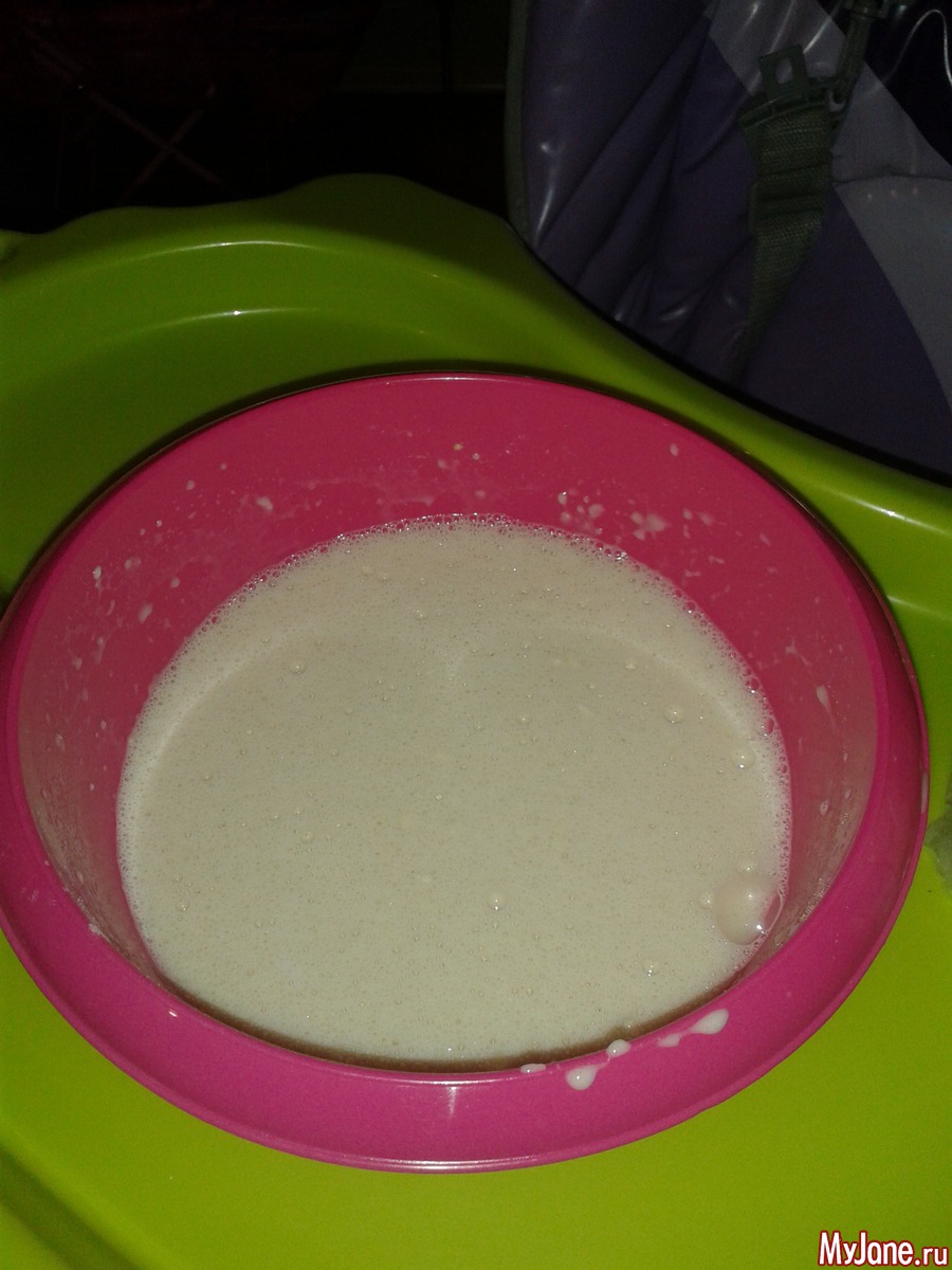 1 стакан теплой воды, 2 ст. ложки сахара, 20 г свежих дрожжей, размешать и оставить до образования пены.