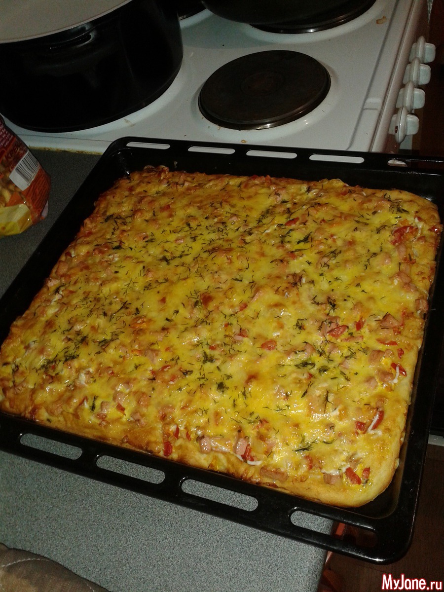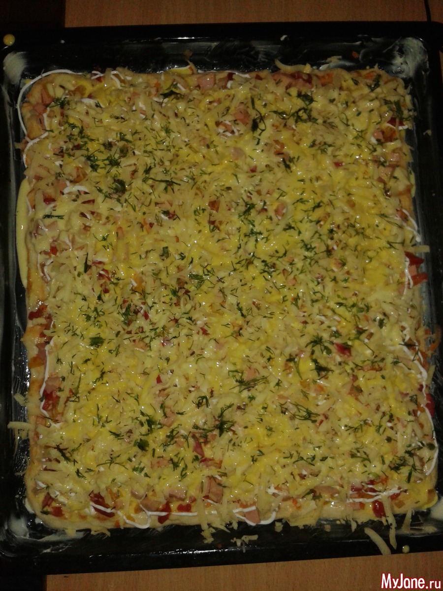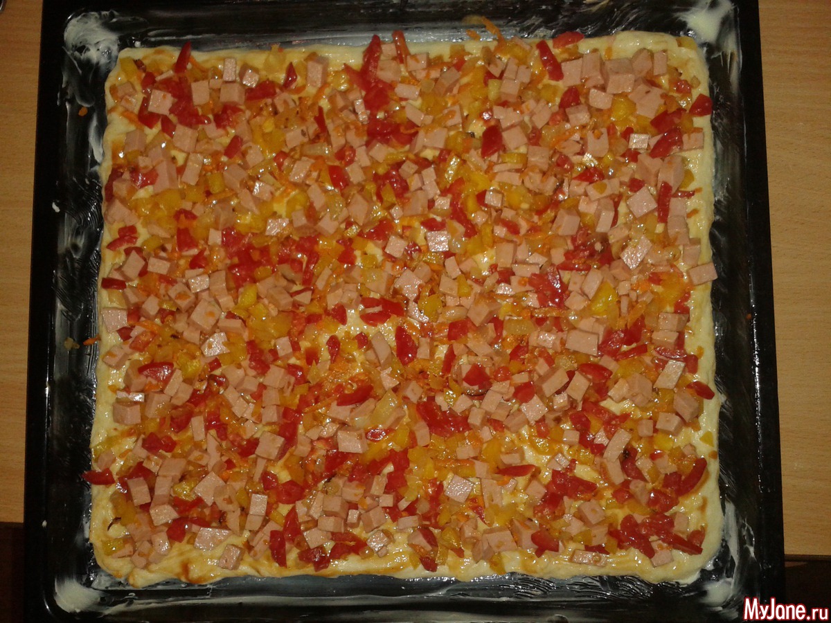 Выложить тесто (предварительно замесив обычное по консистенции дрожжевое тесто, хорошо вымесить) на противень, смазанный маргарином и разровнять руками. Смазать томатным соусом, положить слой грибов, слой ветчины, слой помидоров, перца, зелень (можно и перемешать:-)