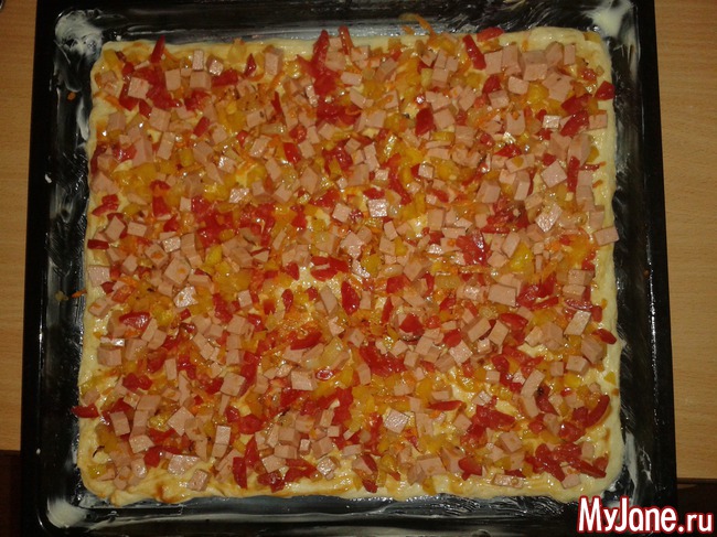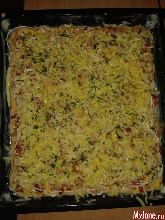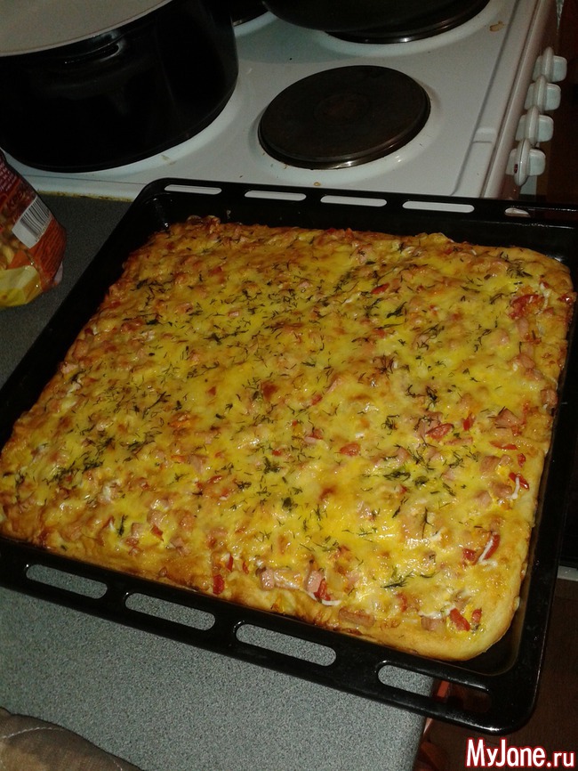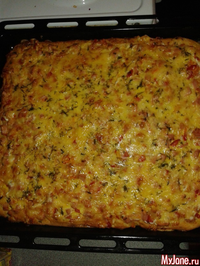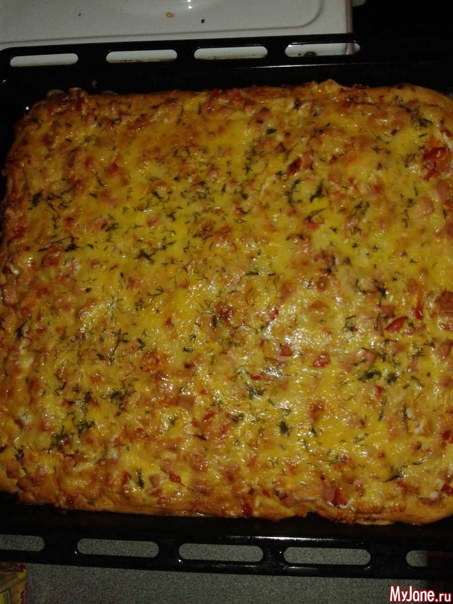 Выложить тесто (предварительно замесив обычное по консистенции дрожжевое тесто, хорошо вымесить) на противень, смазанный маргарином и разровнять руками. Смазать томатным соусом, положить слой грибов, слой ветчины, слой помидоров, перца, зелень (можно и перемешать:-)