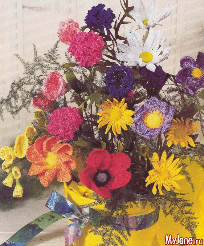 Описание работы для красного цветка: связать цепочку из 6 возд. п. и замкнуть ее в кольцо с помощью соед. ст., 3 возд. п. подъема вместо 1-го ст. с накидом, затем связать 19 ст. с накидом в кольцо, закончить 1 соед. ст. в 3-ю возд. п. подъема. Продолжить работу по схеме 2, каждый круговой р. начинать с указанного в схеме числа возд, п подъема и заканчивать соед. ст. Надеть цветы на стебли и закрепить их серединками, надетыми сверху. После окончания работы сшить лепестки с внутренней стороны на высоту 1 см.