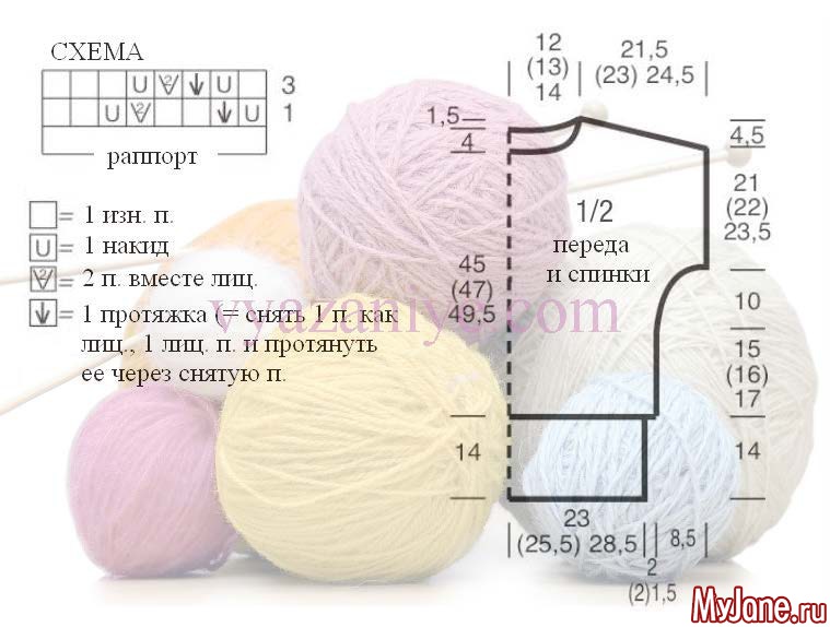 Для этого уже через 45 (47) 49,5 см от планки закрыть средние 18 (22) 26 п. и в каждом 2-м р. закрыть 1 x 3, 2 x по 2 и 3 x по 1 п.
