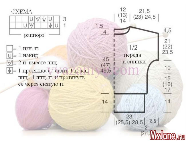 Затем продолжить в след. распределении: кром. п., 22 (26) 31 изн. глади, 38 п. ажурного узора, 22 (26) 31 изн. глади.