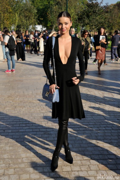 Во время Недель моды бурю эмоций вызвала Миранда Керр, точнее, ее декольте, с помощью которого кокетка-модель не на шутку смутила прохожих перед показом Louis Vuitton.