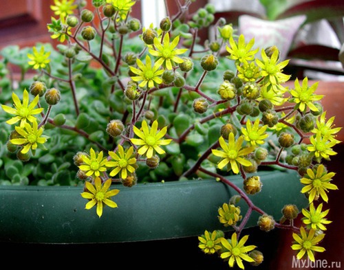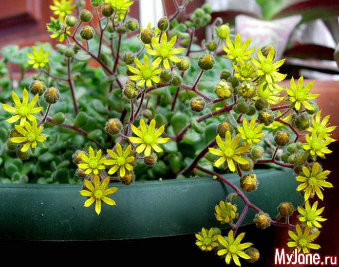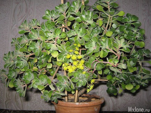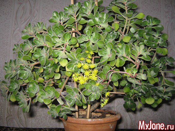 А разводится оно очень легко - отломать небольшую веточку и посадить в влажную земля, принимается почти всегда в первого раза, но вот взрослые растения главное не залить, а то сгниет. Если начинает пропадать, так сразу еще здоровые веточки отламывать нужно и рассаживать. А у меня цвело не чуть - а такой шапкой вокруг всей кроны