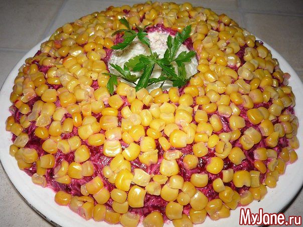 Салат "Подсолнух" с кукурузой - красочный, вкусный, порадует и детей, и взрослых. Он всегда привлекает внимание своим видом и отличается отменным вкусом. Ингредиенты для салата укладываются слоями.
