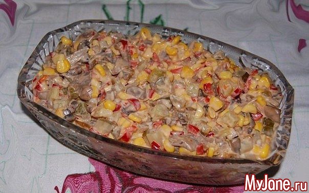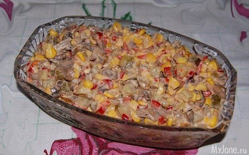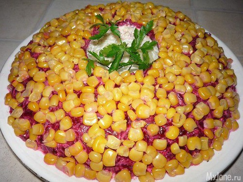 6. Приготовьте большое сервировочное блюдо. Салат "Подсолнух" с кукурузой нужно вкладывать слоями, каждый слой перемазывая майонезом. Итак, на дно выкладываем курицу, смазываем майонезом, затем - морковь и снова майонез, грибы и майонез, яйца и майонез, лук и майонез, а завершает все консервированная кукуруза. Кстати, вместо кукурузы можно использовать тертый желтый сыр.