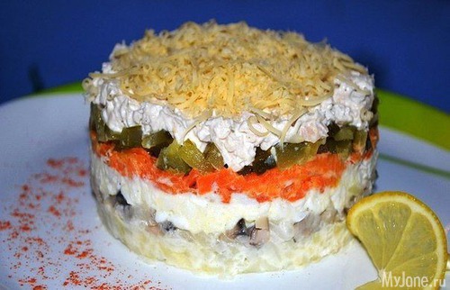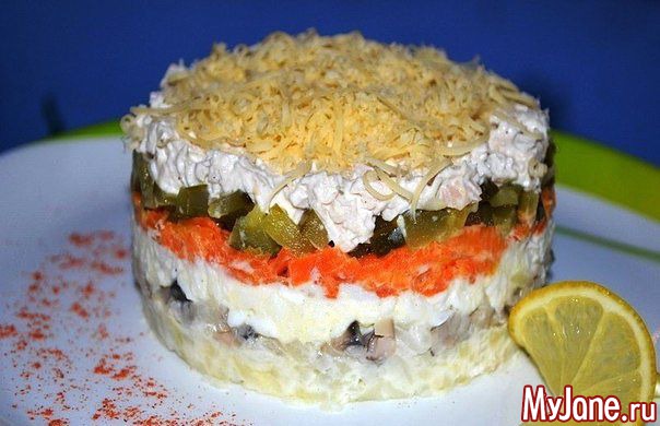 Теперь нам необходимо сложить все ингредиенты в такой очередности: картофель, грибы с луком, яйца, морковь, огурцы, мясо и сыр. Вот теперь наш салатик готов к подаче на стол.