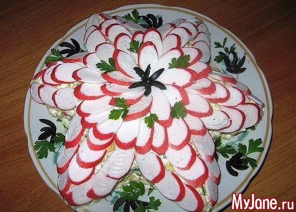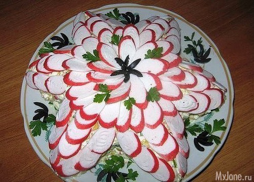 8. Остальные крабовые палочки нарезать длинными пластинками. Выложить сверху салата с небольшим нахлестом.