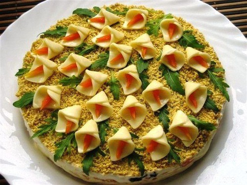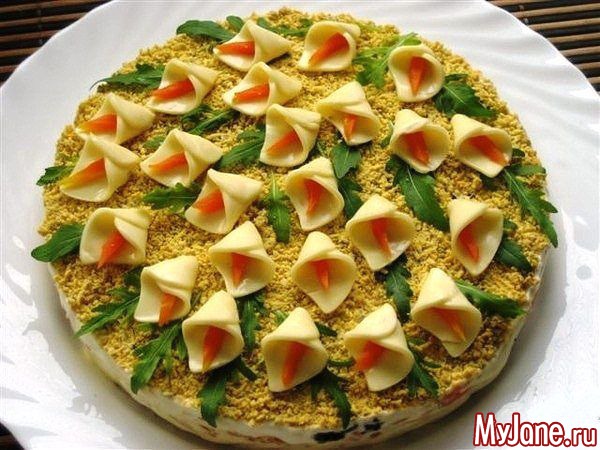 11. Сверху салата выкладывать завернутые конвертиком кусочки сыра. Внутрь каждого вложить кусочек моркови. Украсить салат свежей зеленью.