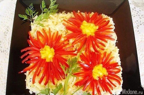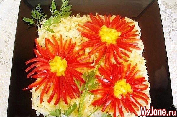 11. Украсить салат тоненькими полосочками красного перца, а серединки сделать из нарезанного желтого перца.