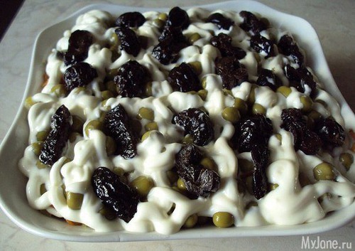 7. Выкладывайте салат "Прага" слоями в большую салатницу. Сверху - майонез и сливы. Можно салат просто перемешать с майонезом, а сверху украсить майонезом и целыми сливами.