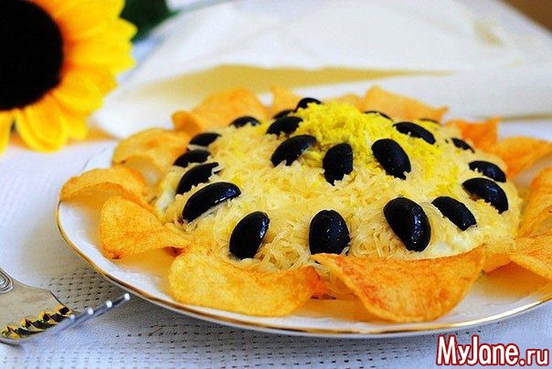7. А теперь делаем подсолнух. Выкладываем черные семечки - разрезанные вдоль маслины. А по кругу укладываем или втыкаем в нижний слой салата чипсы в виде лепестков. Можно посадить на наш подсолнух и божью коровку. Она "лепиться" из половинки помидорчика черри и нескольких майонезных точек на спине.