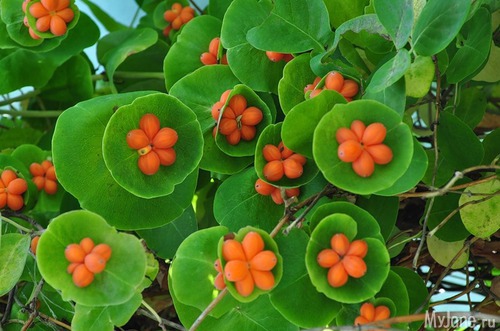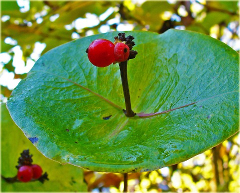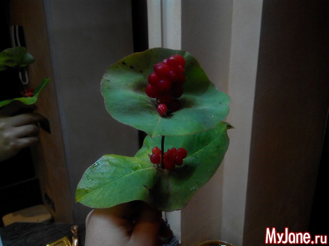 Растет оно ягодками книзу, а не кверху, как я держу на фото. Как видите, листы очень интересной формы и выглядят как тарелочки, на которых располагаются красные ягодки.