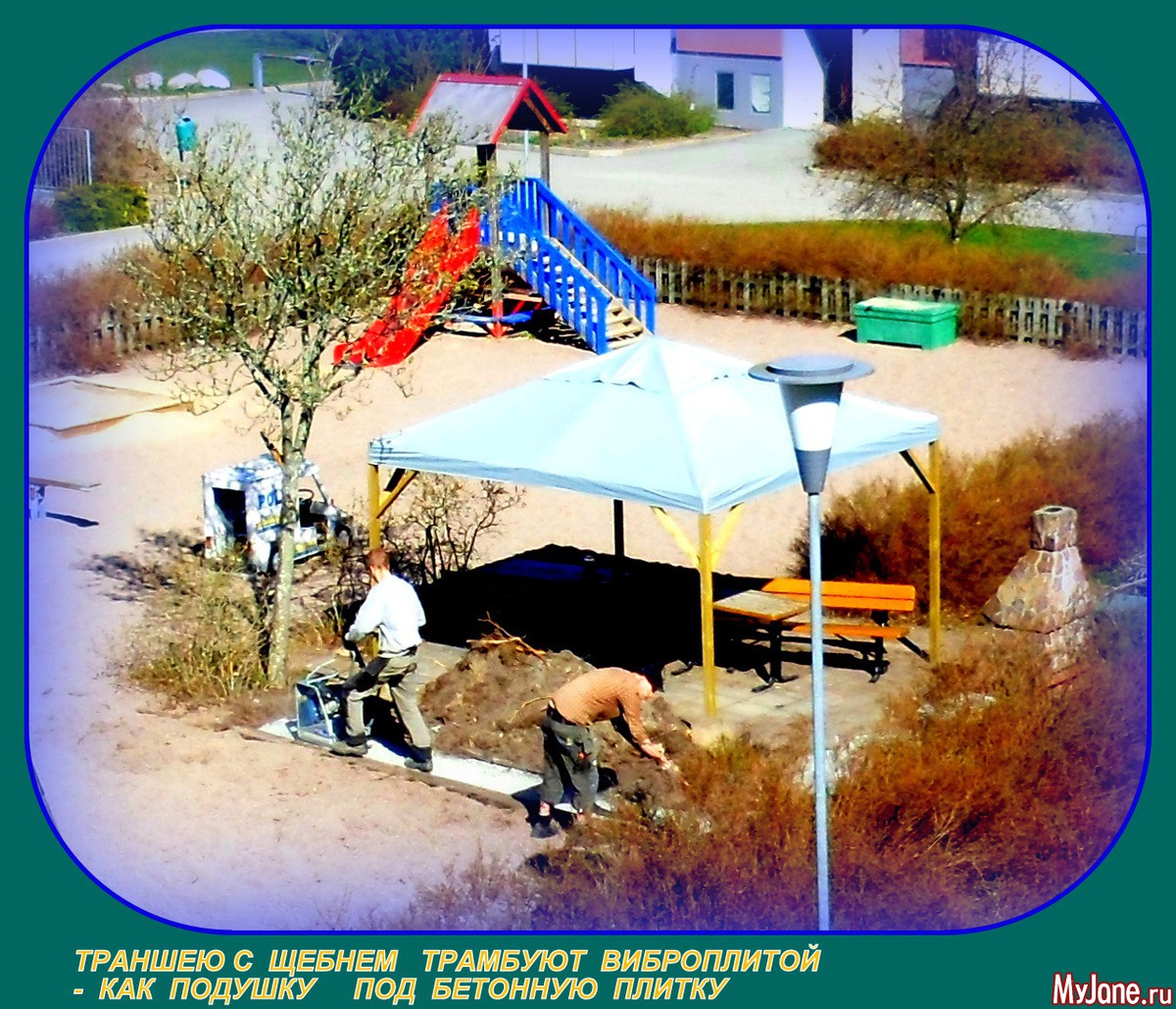 До реконструкции площадка для барбекю была надёжно отделена густыми кустарниками от детской площадки с качелями. Таким образом, качели и гриль были практически в отдельных зонах внутри нашего двора. В определённом смысле это было не совсем удобно в том случае, если на пикнике присутствовали дети - они вынуждены были находиться за столом, что для детей не особенно интересно во взрослой компании. Коммунальщики решили соединить эти две зоны, для чего удалили разделяющую живую изгородь между этими зонами, и на этом месте уложили дополнительно два ряда битонной плитки, что позволило увеличить размер грильной площадки.