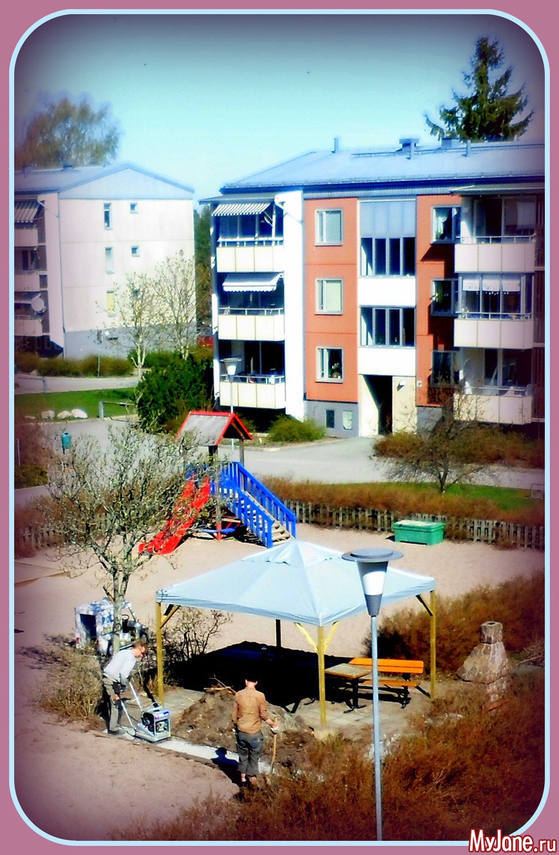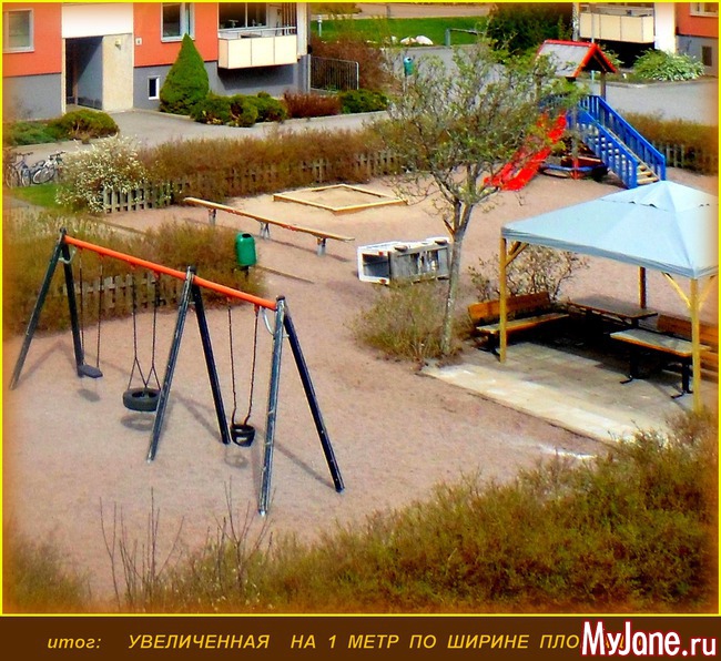 Теперь взрослые могут заниматься приготовлением барбекю и посиделками за столом, а детвора может на глазах у взрослых играть на площадке и качаться на качелях... Нет теперь разделяющего площадки кустарника. Дети находятся в зоне визуального охвата взрослых...