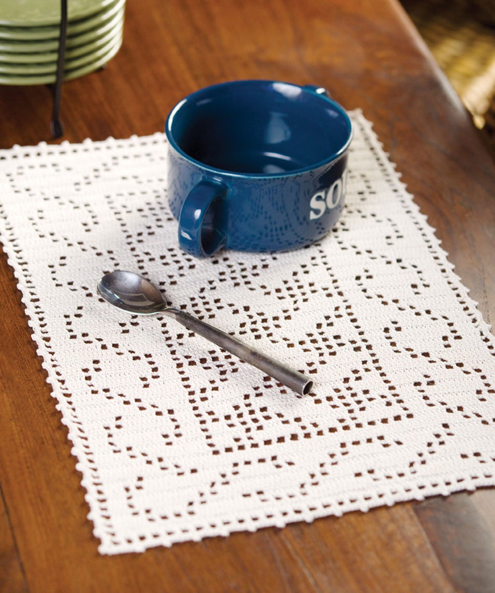 GAUGE: 12 mesh = 4”; 12 rows = 4” in filet pattern.
