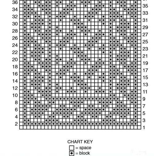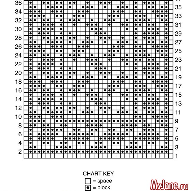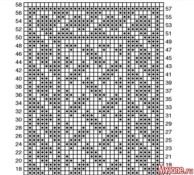 А клеточка с кружочком внутри - это вместо двух воздушных петель - два столбика с накидом. Получается узор за счёт чередования "окошечек" и заполненных клетчек.