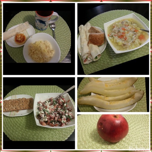 14:00 обед: суп куриный с цветной капустой, хлеб зерновой, 2 рулетика (лаваш+творог+семга с/с+огурец)