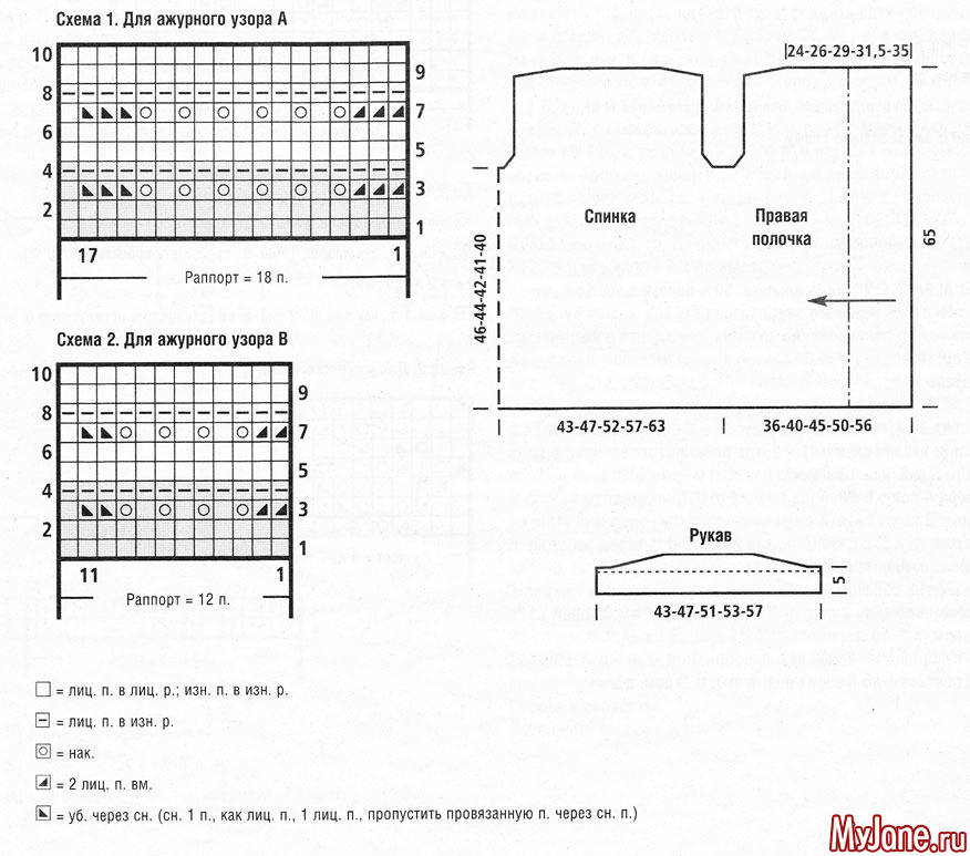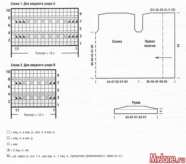 Ажурный узор А и В: вяз. по схемам 1 и 2, где показаны только лиц. р.