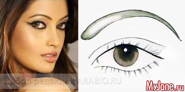 поднятые вверх изогнутые дугообразные брови. Противопоказаны тонкие брови.