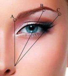 Как рассчитать идеальную форму брови.Проделаем несколько манипуляций, чтобы подобрать идеальную форму бровей. Возьмите в руки карандаш и соедините им точку у крыла носа и точку у внутреннего угла глаза ( линия А). Точка пересечения карандаша с бровью – это отметка, идеальная для начала брови. Все волоски, которые находятся за этой точкой ближе к переносице, следует удалить.