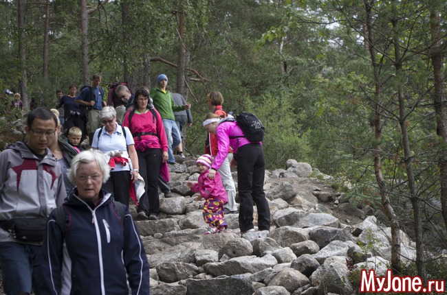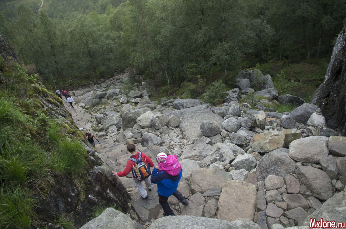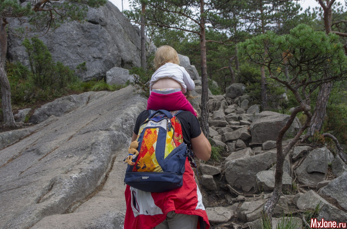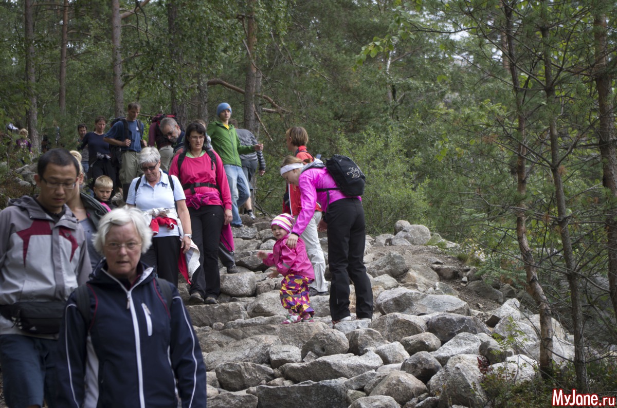 Доехали мы до кемпинга, быстренько развернули палатку, поели, что бог послал и выдвинулись в сторону Прекестолена. Здесь мы пока еще веселые и счастливые и совершенно не в курсе того, что ждет нас впереди. До поездки на Прекестолен я во всех отчетах читала, что это восхождение чуть-ли не для инвалидов.