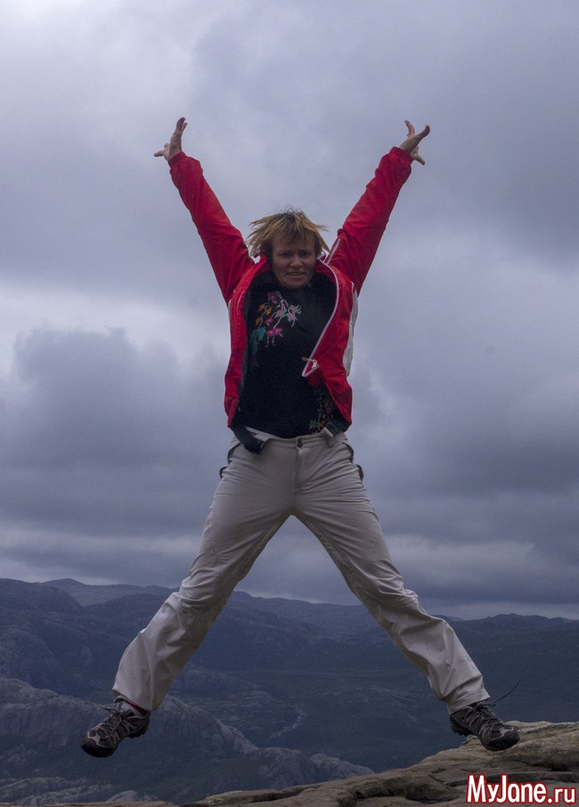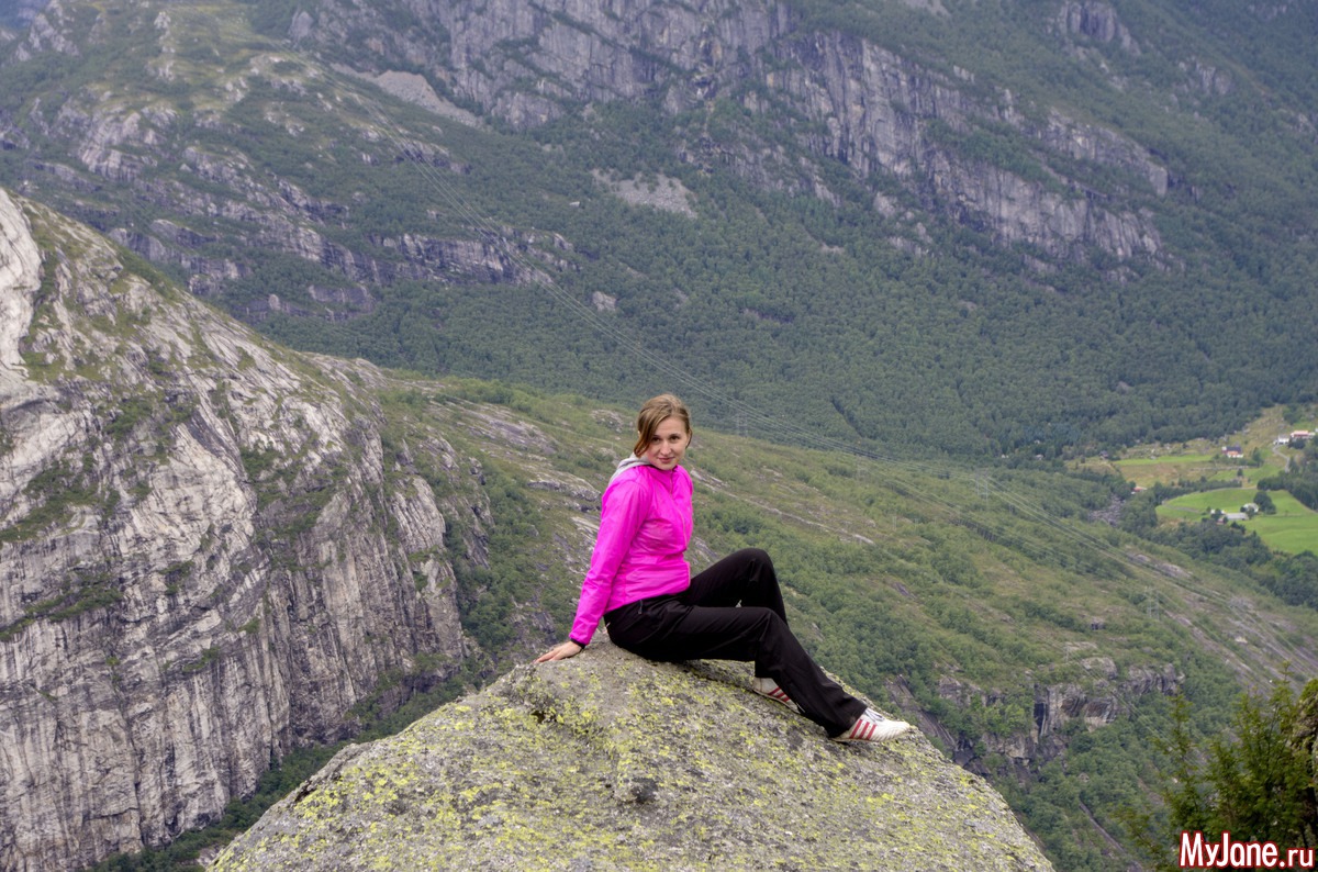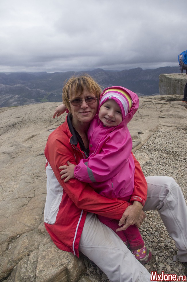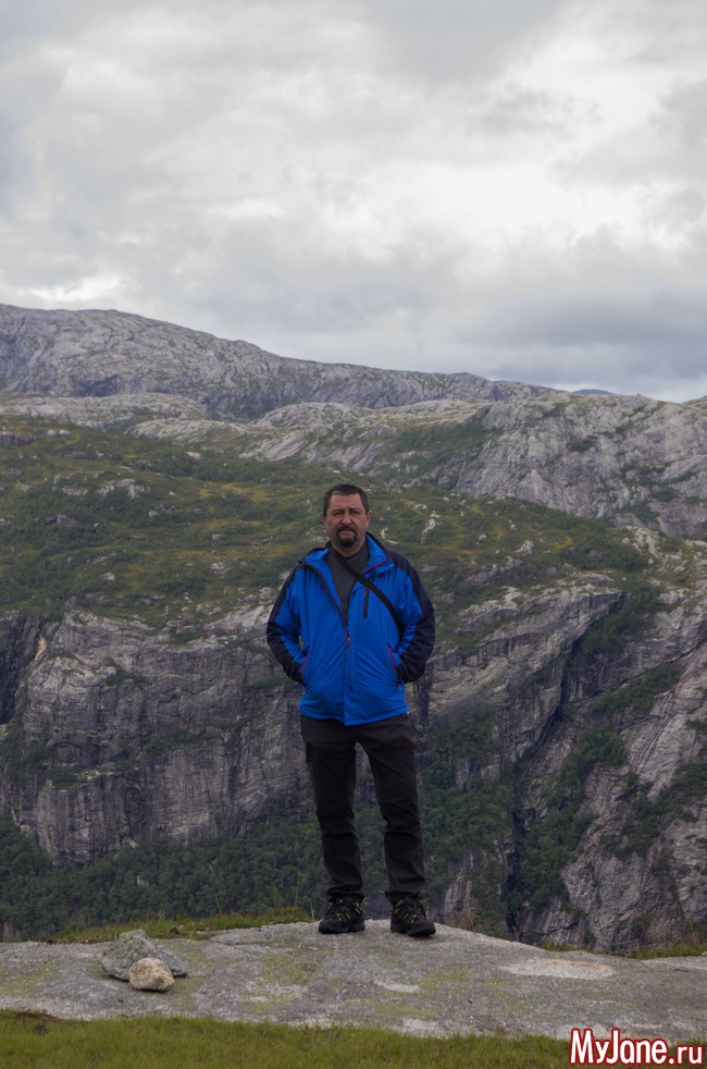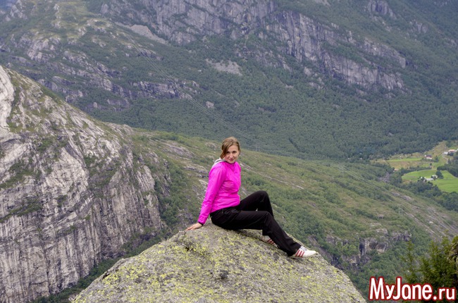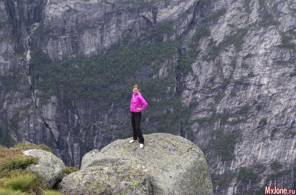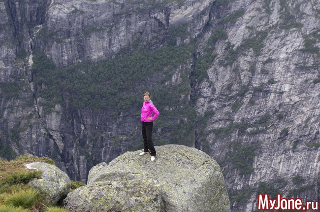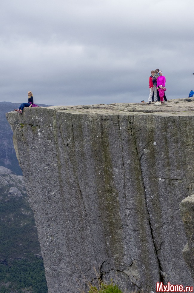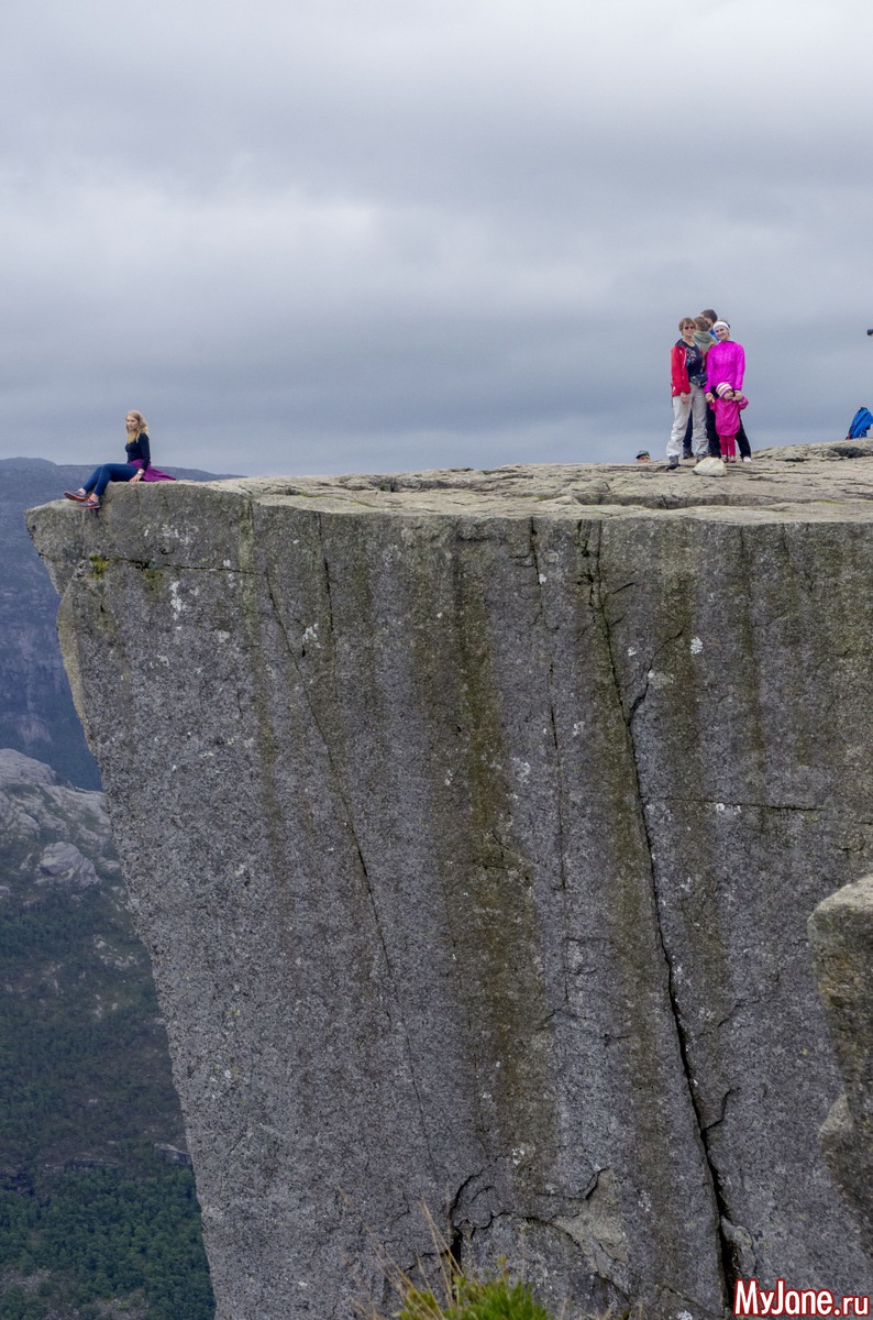 Розовые пятнышки - это мы. Я, конечно, хотела посидеть на краешке, свесив ножки, но у Игоря началась истерика и он не пустил меня. Хотя, признаюсь в то время, пока мы шастали по Прекестолену, мне удалось выкроить момент, подползти к краю пропасти и посмотреть вниз. Настюха в это время мужественно прыгала между мной и Игорем, чтобы он не дай бог, не заметил мои поползновения.