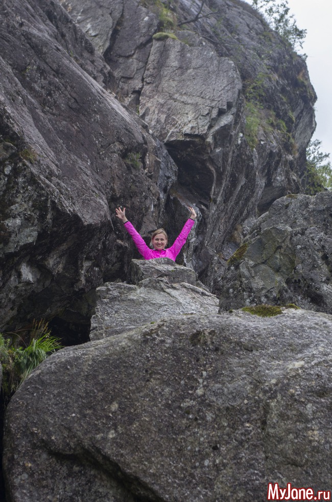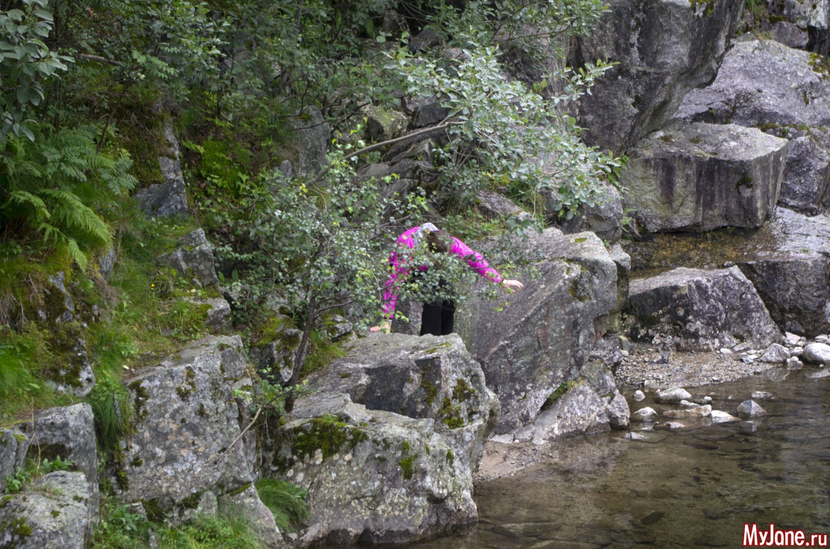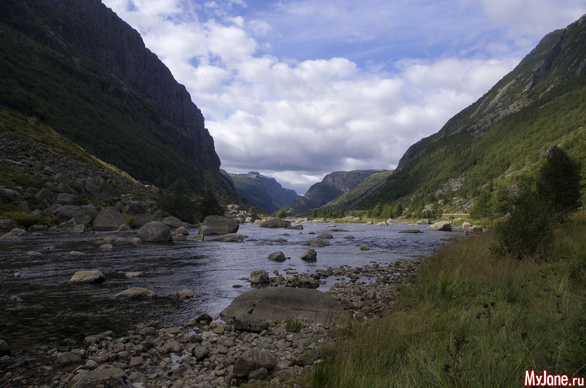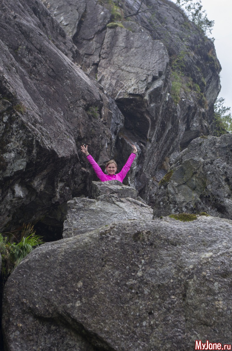 Поужинали и легли спать. Мы с Игорем и Ксюхой в палатке, Настя с Никой в машине. Ночью проснулась от шума дождя. Лежала и думала, только бы он закончился, только бы закончился. Ну или хотя бы из проливного превратился в моросящий. На утро дождя как не бывало. И теперь нас ждало путешествие на новый объект для покорения - Кьераг болтен. Это такой камушек, застрявший между двух скал на высоте около 800 метров.