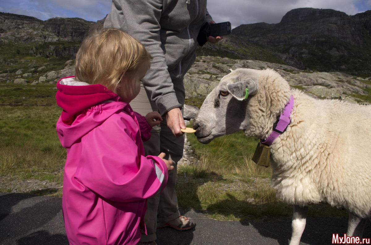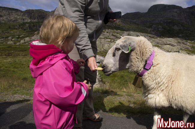 Поехали туда по потрясающе красивой дороге через горный перевал. По пути познакомились с наглыми норвежскими овцами, которые моментально бросились к машине, стоило мне открыть дверь. Типа ну дай что-нибудь вкусненькое. Пришлось немного покормить их. Они такие классные, шерстяные