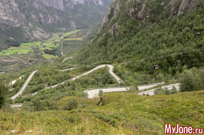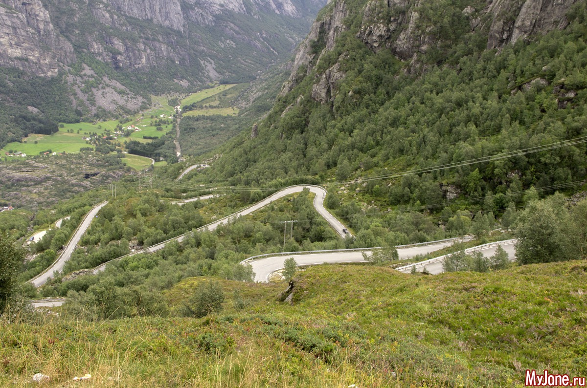 А вот по этой дороге нам придется спускаться вниз, к устью фьорда, чтобы сесть на паром и доплыть до нашего кемпинга. 27 крутых поворотов. Считается одной из самых опасных дорог мира. Чего тут опасного, я так и не поняла. Едешь себе потихонечку на второй скорости. Ну колодки тормозные начинают подгорать, ну так в этом ничего страшного.