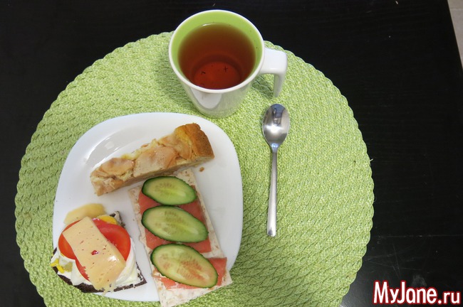 1 бутер (хлебец+рикотта+красная рыба+огурец), 1 бутер (хлеб+рикотта+яйцо+помидор), кусочек пирога (вчера у нас были гости, так испекла по такому случаю новый пирог - "цветаевский яблочный", всем очень понравился, прям захвалили меня, вот утром решила сама попробовать - действительно вкусно!