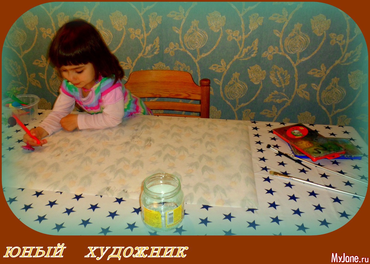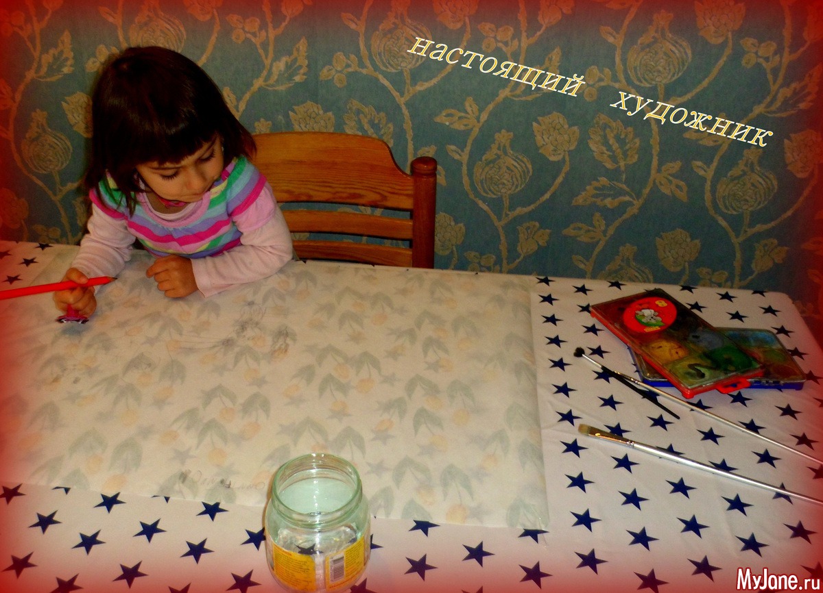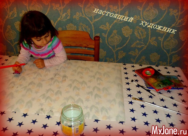 Не успела я приклеить лист скотчем за уголки, как моя внучка уже засуетилась - "хочу рисовать"... нашла моментально карандаш, я принесла ей краски и кисти, налила в баночку воды. И процесс пошёл.