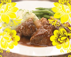 Отдельно обжарить нарезанный ломтиками лук, прибавить немного муки и также слегка обжарить. Подготовленный таким образом лук подать как гарнир к мясу.