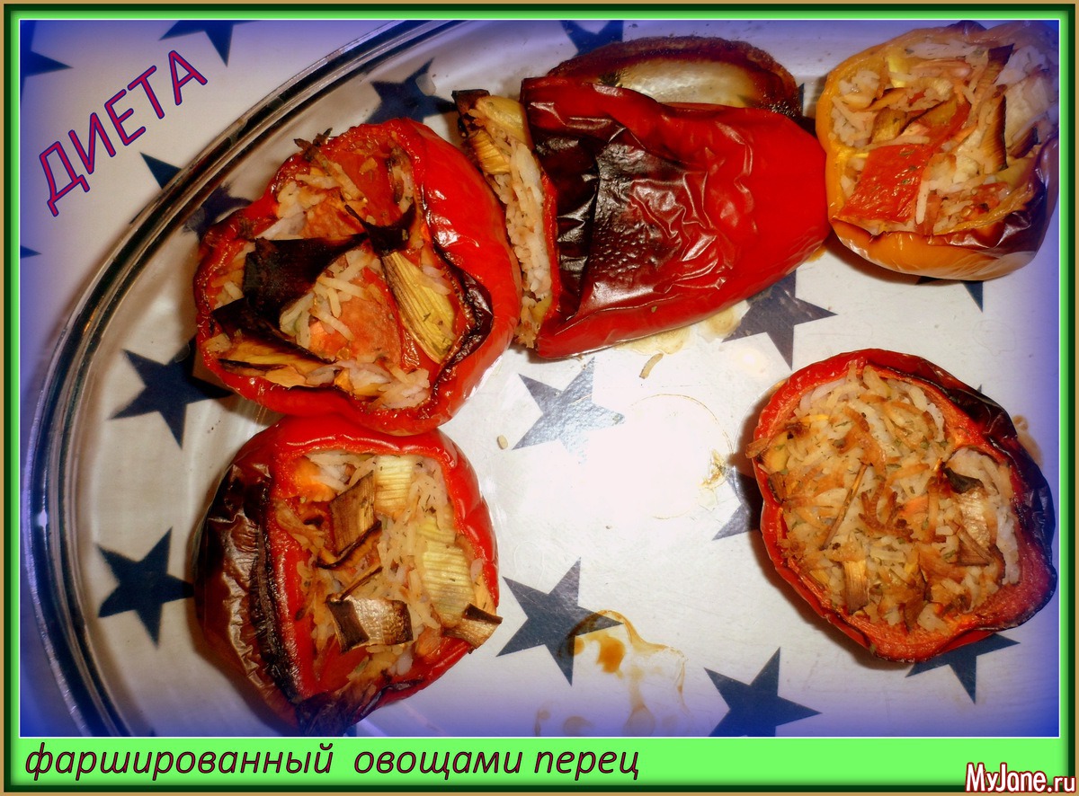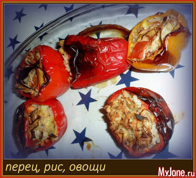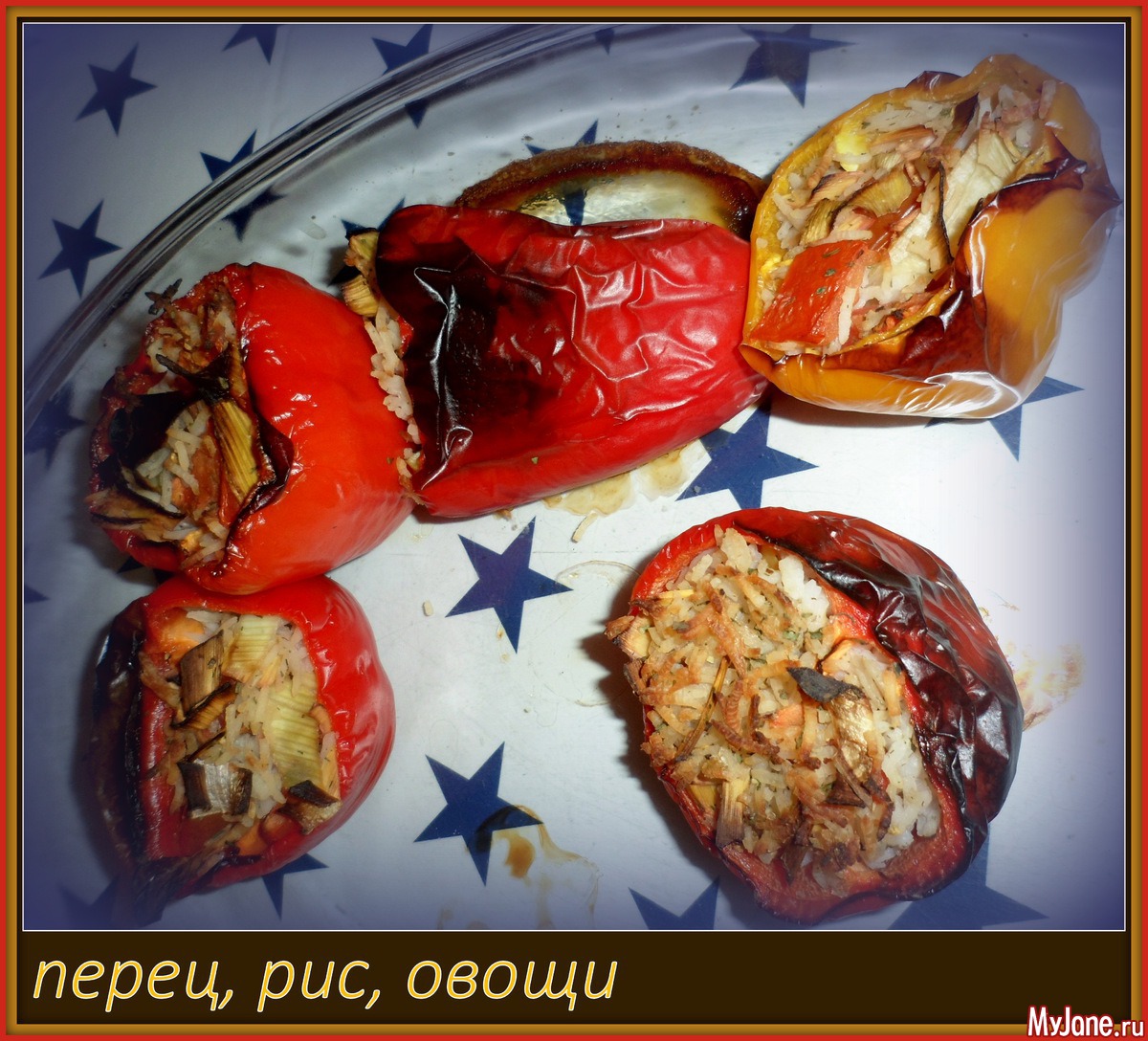 Берём стекляшку ( без всякого жира), закладываем отварной рис с сырыми овощами в красные и жёлтые болгарские перецы. И в духовку. Запекаем приблизительно при 175* С.