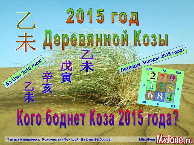 Предсказать наиболее точно, каким будет для вас наступающий Новый 2015 год Деревянной Козы, можно только на основании вашей персональной Карты Ба Цзы - Карты Судьбы и Удачи, построенной по вашей дате рождения, с указанием часа, дня, месяца и года вашего рождения. Фэн Шуй, слишком индивидуален, слишком много составляющих, которые влияют на нашу жизнь.