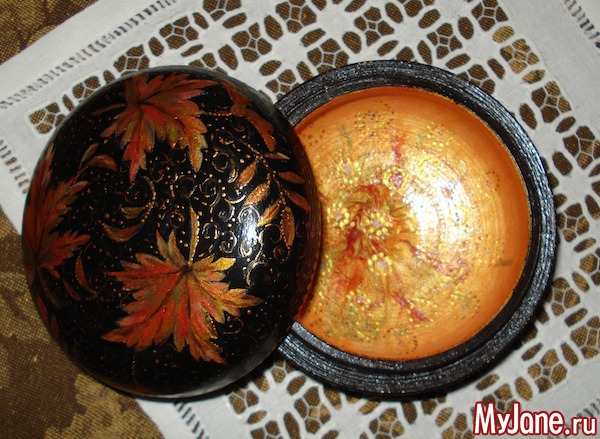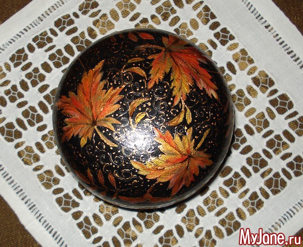 Сделала еще одну шкатулку на осеннюю тему. Не очень довольна результатом, поскольку очень трудно рисовать на округлой поверхности. Так что не судите строго