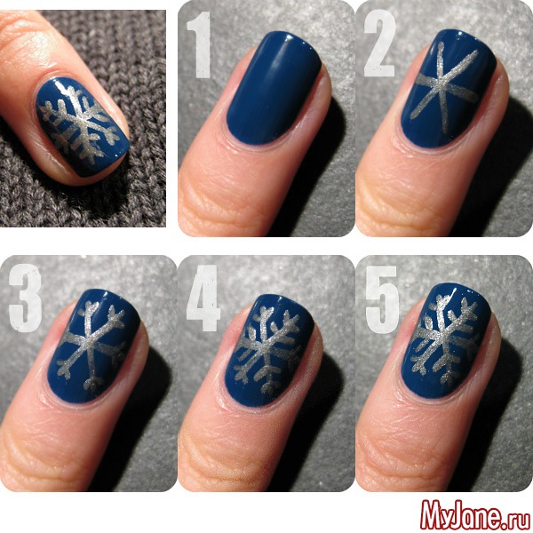 Форма снежинки - правильная геометрическая, чаще восьмигранник либо шестигранник. Прорисовать ее можно при помощи специальной кисти, иголки, зубочистки или даже заостренной спичкой