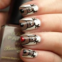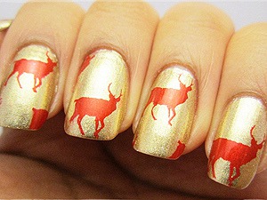 В случае если необходимо работать с трафаретом, понадобится недюжинная внимательность и аккуратность. Дождитесь полного высыхания золотого лака, аккуратно разместите на ногте трафарет и придерживая его (ни в коем случае его нельзя смещать!), прокрасьте поверхность оленя. Следите, чтобы мелкие детали (ноги, рога) были тщательно прорисованы. Четким движением только вверх снимите трафарет, оставьте рисунок до полного высыхания. Такой способ нанесения рисунков сложен, поэтому желательно несколько раз потренироваться на «нейтральной» территории, например, на накладных ногтях.