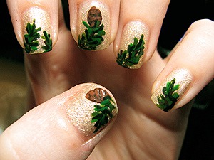 Елки и шишки – классика жанра, традиционные новогодние рисунки на ногтях.
