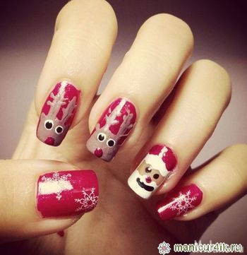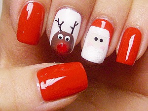 Если вы не против немного потрудиться, то Санта и его помощники-олени, без сомнения, будут прекрасной идеей для новогодних рисунков для ногтей.