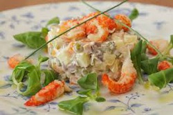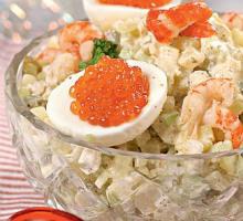 Последний классический вариант рецепта салата Оливье завоевал популярность уже в 90-е годы, с появлением в магазинах креветок и раков, каперсов и оливок. А также свежих огурцов в период Нового года в достаточном количестве. В оригинальном исполнении он родился еще в светлые Брежневские времена и получил название салат столичный. Наверно потому, что все компоненты только в столице достать и можно было.