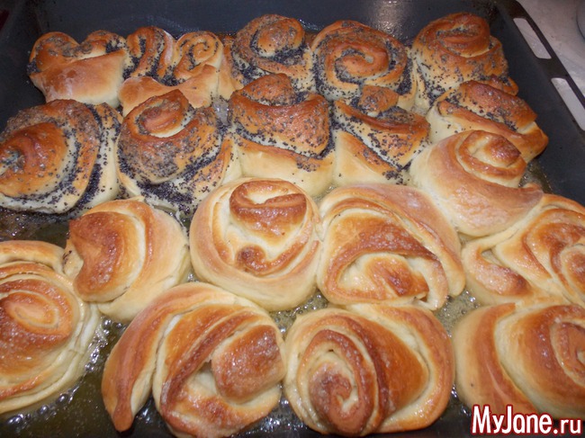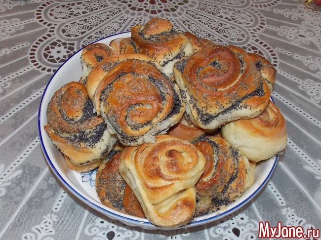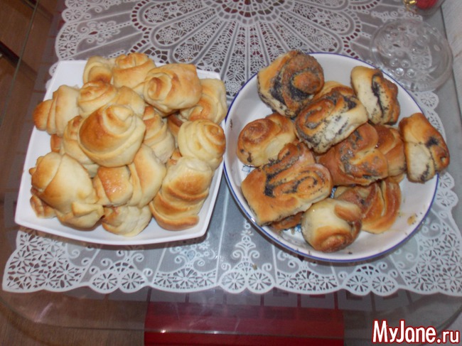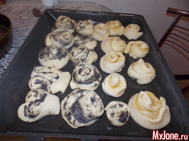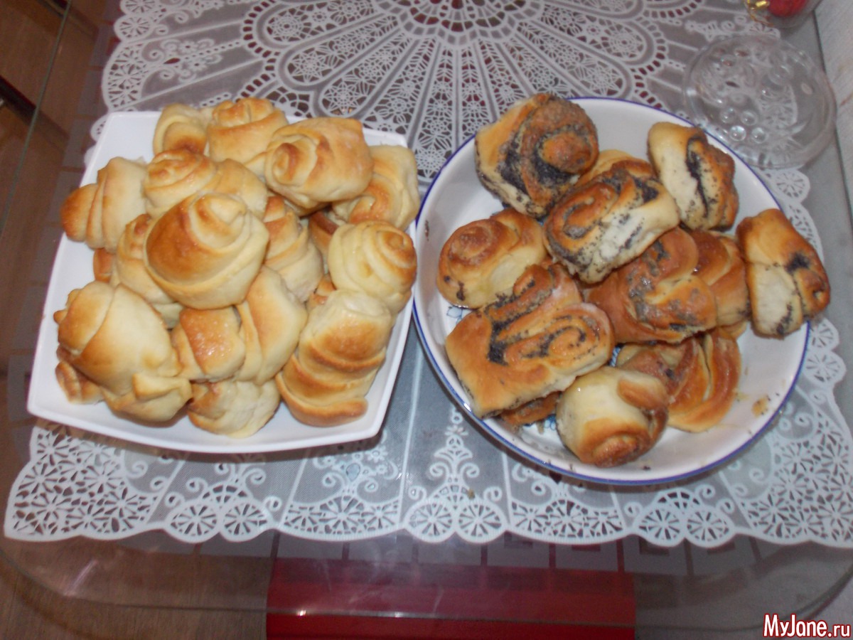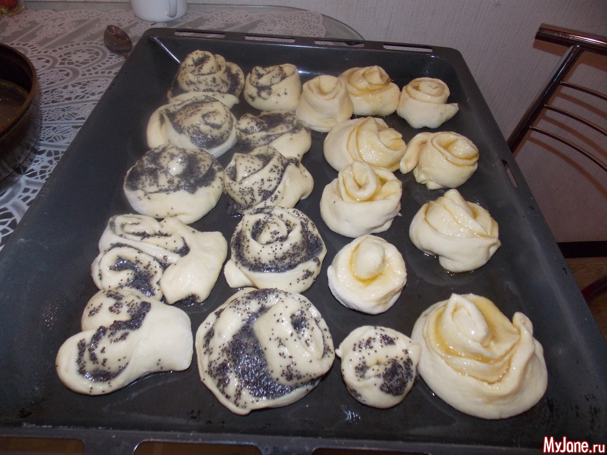 Раскатывается клубочек теста на него распределяю или завареный мак с сахаром (150гр. молока,50 гр. сахара,20 гр. мака, варю пока не загустеет масса, и уже остывшую наношу) или просто масло сливочное растопленно и сверху сахар. Скручиваю в рулет, режу на части по 7-10 см, снизу скрепляю и получается розочка)))