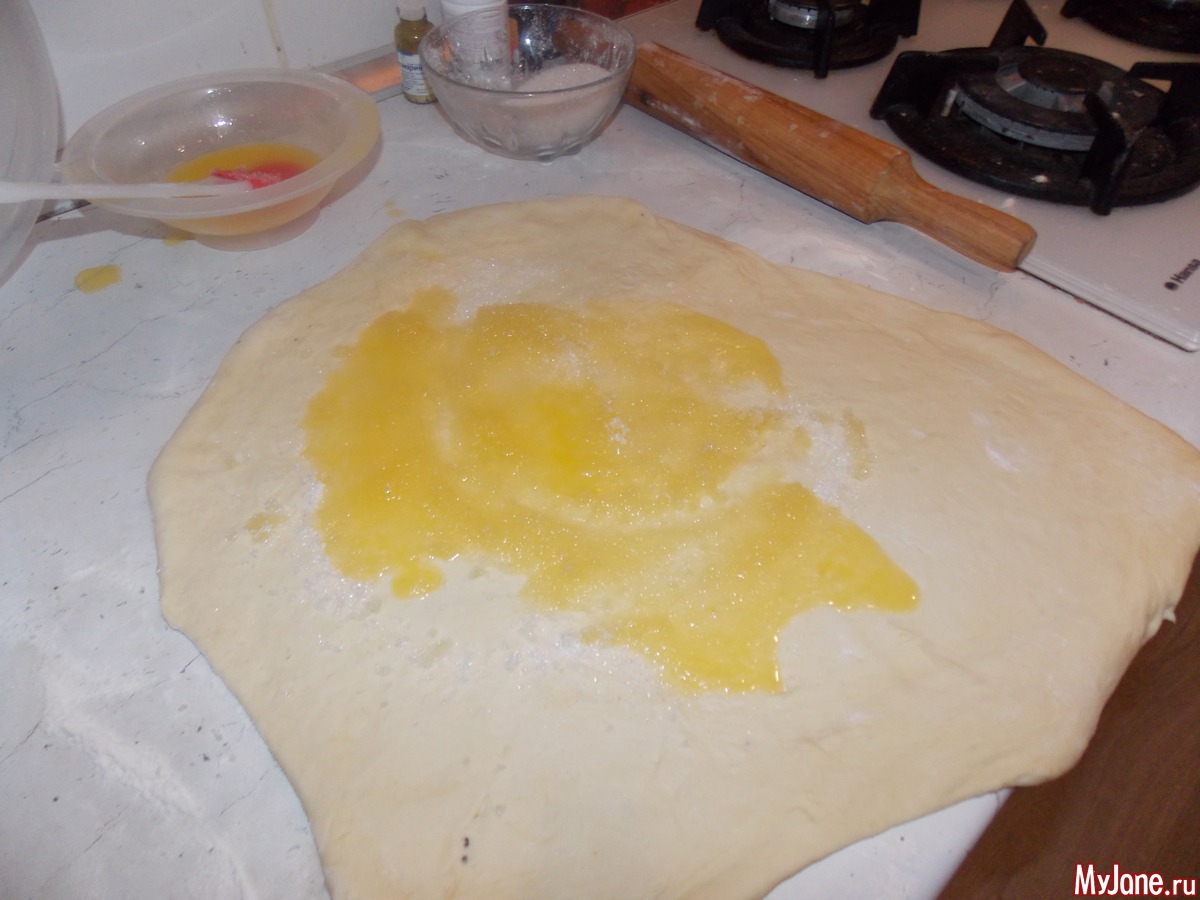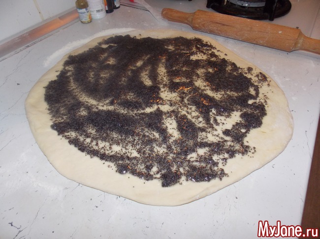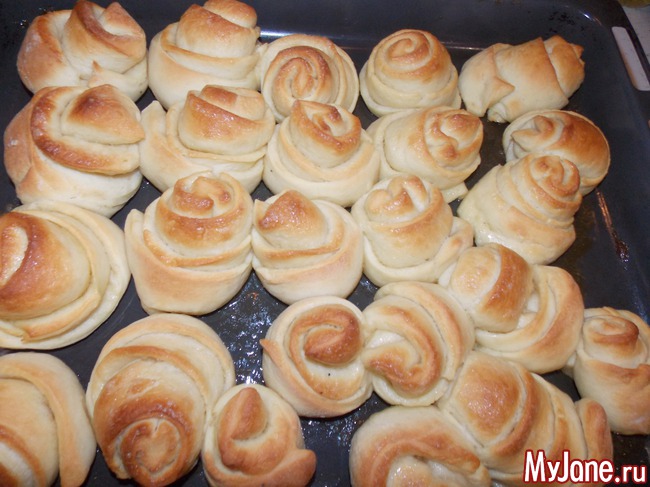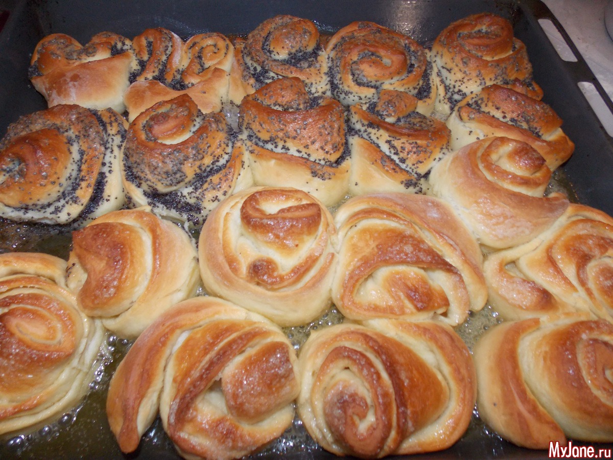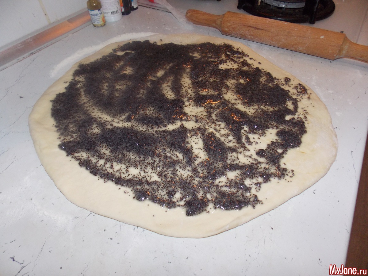 Раскатывается клубочек теста на него распределяю или завареный мак с сахаром (150гр. молока,50 гр. сахара,20 гр. мака, варю пока не загустеет масса, и уже остывшую наношу) или просто масло сливочное растопленно и сверху сахар. Скручиваю в рулет, режу на части по 7-10 см, снизу скрепляю и получается розочка)))