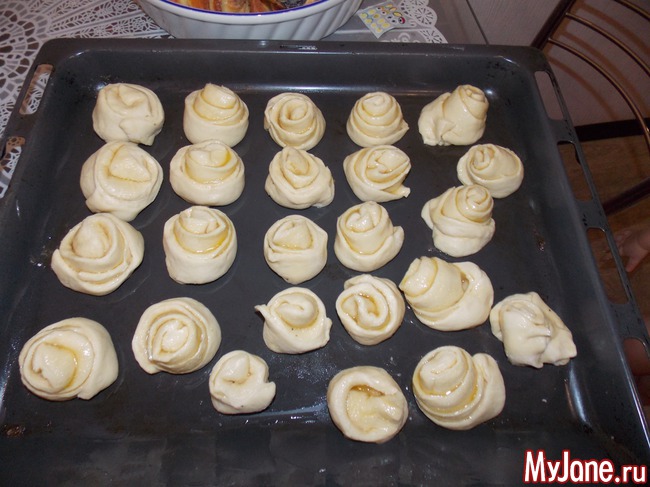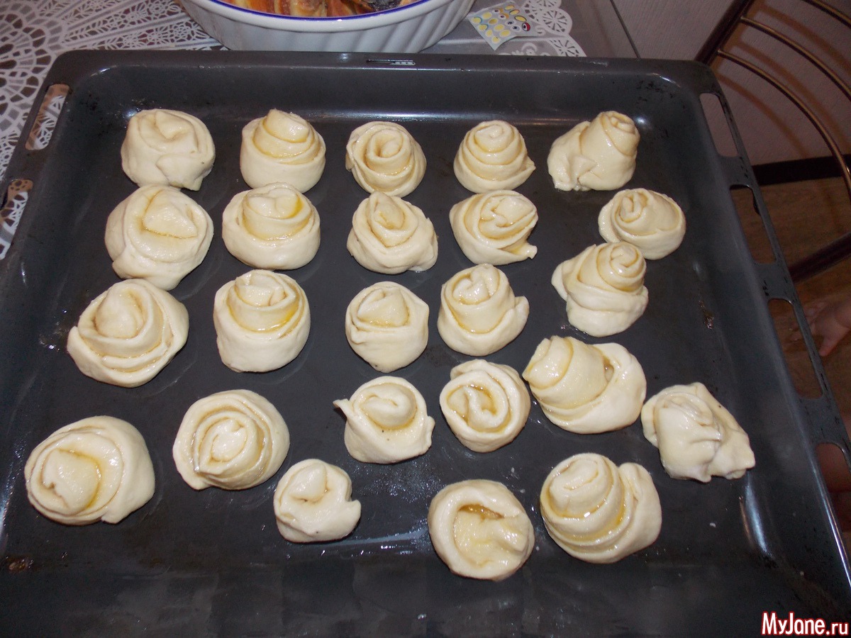 Выкладываю на противень смазанный раст. маслом. Булочки ничем не смазываю сверху)