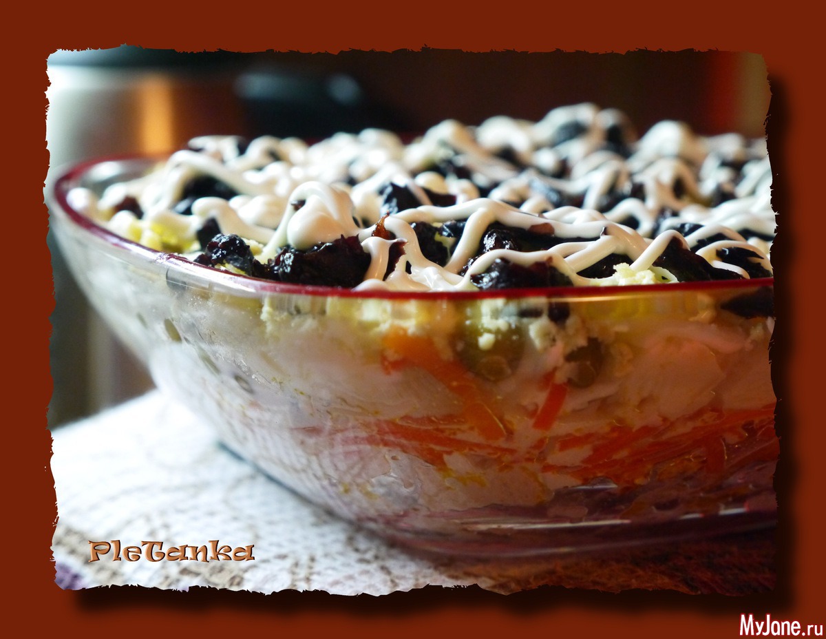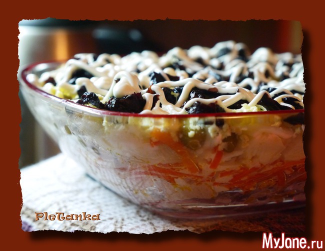 Всё промазать майонезом со всех сторон и равномерно посыпать желтком (украсить можно и по своему желанию. У меня сверху был чернослив и майонезная сеточка на нём).