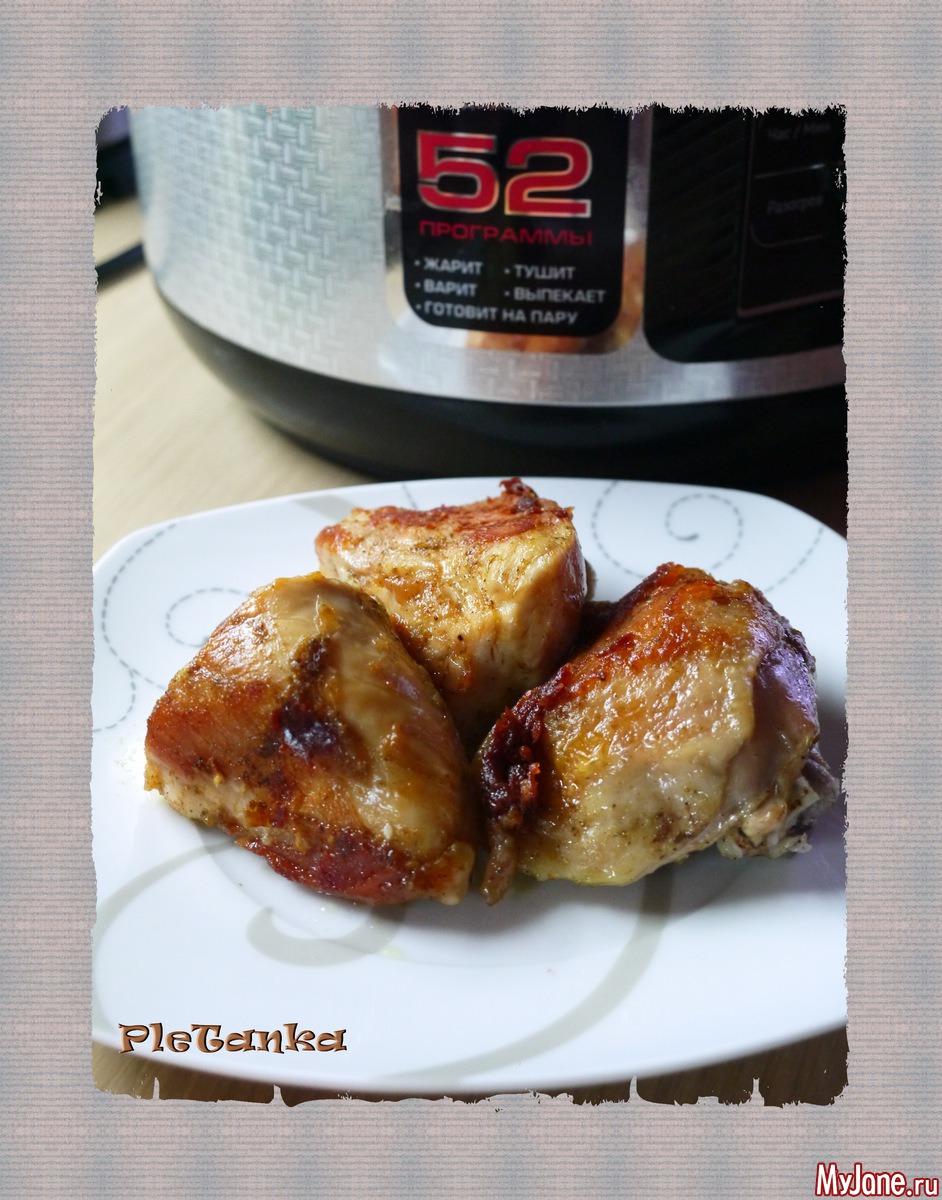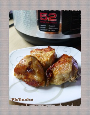 Смазать дно мультиварки растительным маслом, положить курочку, можно положить на каждый кусочек по небольшой дольке чеснока. Программа "Выпечка " 30 минут, по окончании, перевернуть и еще на 30 минут.