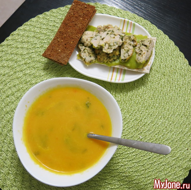 суп-пюре тыквенный с креветками, два хлебца, бутер (хлебец+пюре из брокколи и тыквы+котлета куриная)