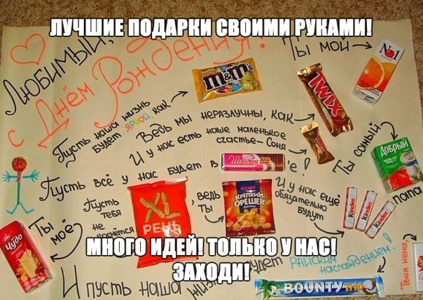 Я, кст, вчера приобрела все нужные шоколадки и соки, ватман не купила, но думаю можно красивый подарочный мешок купить, и все шоколадки, с наклеенными на них бумажками с надписями, положить туда.