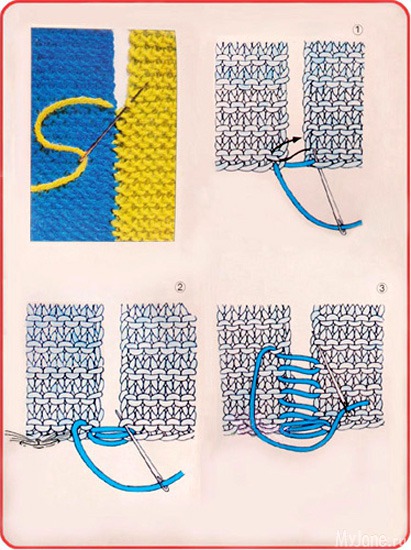 Вденьте конец нити в иглу для пряжи. Разверните обе детали лицевой стороной к себе и движением сзади вперед введите иглу в угловую петлю детали, не имеющей свободного конца нити. Введите иглу сзади вперед в угловую петлю друго детали, протянув нить «восьмеркой». Затяните нить, чтобы скрыть зазор.