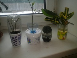 Три черенка гибискуса простояли месяц в воде и только слегка покрылись каллюсом - растительной тканью, из которой развиваются потом корни. Один лист фиалки сгнил, а второй решил не капризничать и дал корешки.